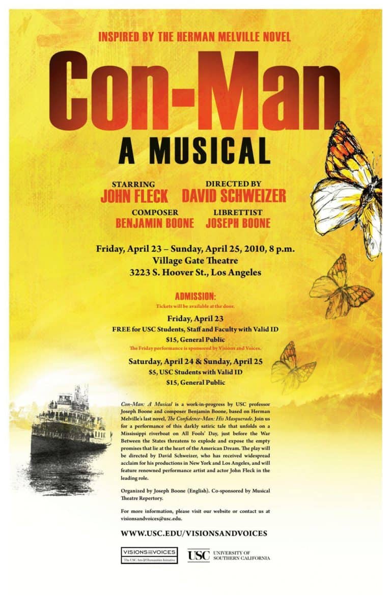 Imagine April Fool’s Day, 1860, as a river boat travels down the Mississippi and through America’s divided heartland in this musical adaptation of Herman Melville’s darkly satiric novel, The Confidence Man, His Masquerade, with a libretto written by Joseph Boone and music composed by Benjamin Boone.